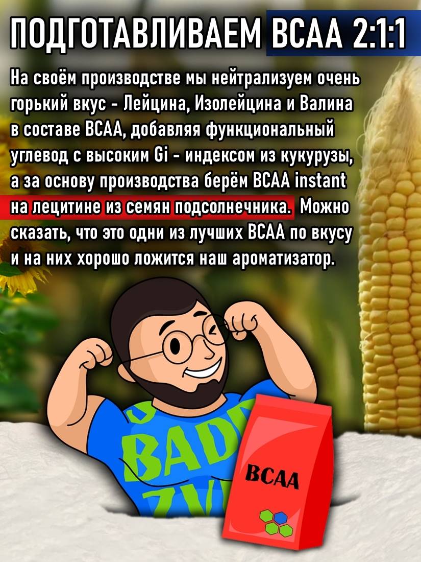 Это специально подготовленная формула аминокислот бцаа для добавления вкусовой добавки. Данные бцаа имеют более лояльную структуру для вкусовых рецепторов человека и легко приобретают вкус ароматизатора. Отличие от тех которые продаются в магазинах в красивых банках в том, что вы не переплачиваете за готовую смесь, а перемешиваете вкус с бцаа самостоятельно, сэкономив большое количество денег. Так же бцаа для добавления вкуса имеют большое преимущество для набора массы, аналогично гейнеру, так как там использован многофункциональный углевод который часто идёт в смеси для набора массы.