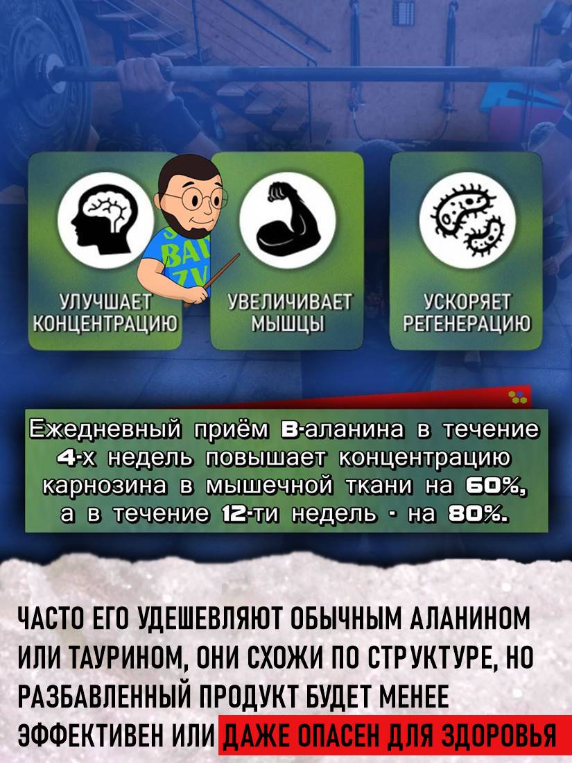 канал о добавках.Противопоказания к применению: особого негативного влияния на организм во время приема Бета-Аланина не замечено. Наоборот он выступает в качестве стимулятора, активирующего жизненные функции организма. Однако при передозировке может возникнуть парестезия – раздражение периферической системы, сопровождающееся дискомфортом в области мышц и конечностей. Долгий период времени приема Бета-Аланина без перерывов приводит к переизбытку вещества в организме, и как следствие, угнетению функций печени и почек, белковому отравлению.