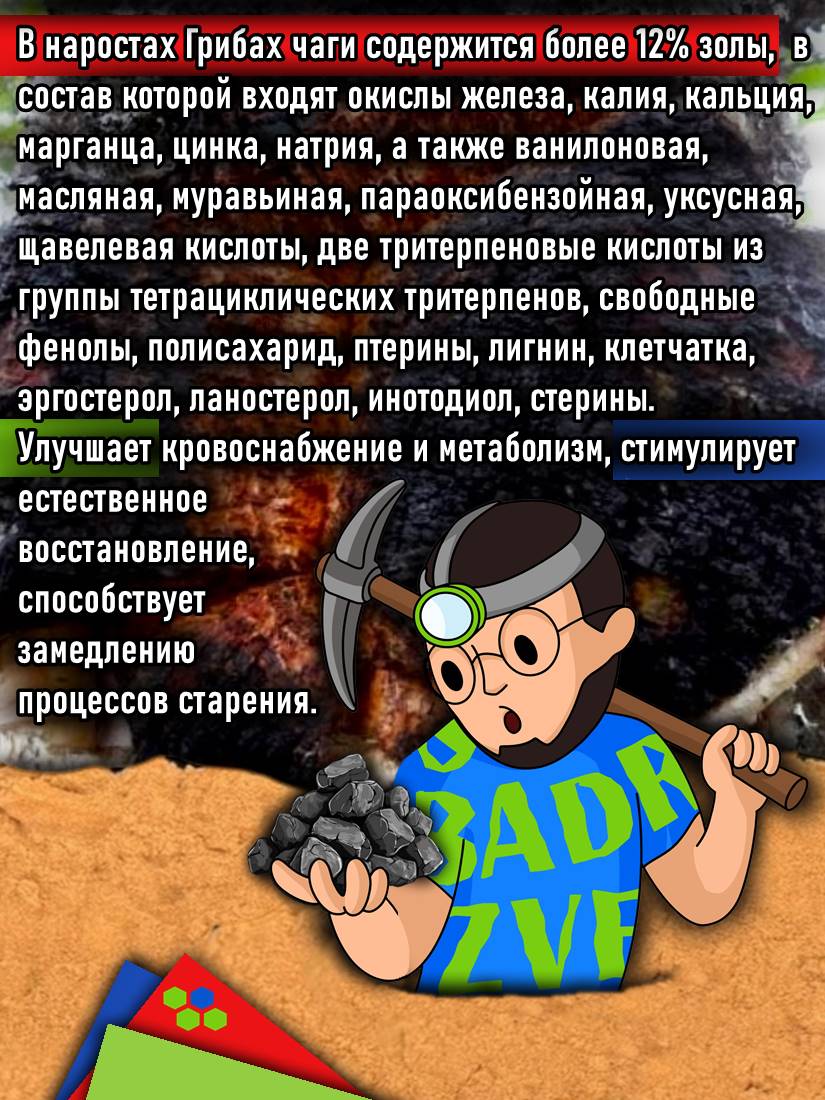 В наростах Грибах чаги содержится более 12% золы, в состав которой входят окислы железа, калия, кальция, марганца, цинка, натрия, а также ванилоновая, масляная, муравьиная, параоксибензойная, уксусная, щавелевая кислоты, две тритерпеновые кислоты из группы тетрациклических тритерпенов, свободные фенолы, полисахарид, птерины, лигнин, клетчатка, эргостерол, ланостерол, инотодиол, стерины. Улучшает кровоснабжение и метаболизм, стимулирует естественное восстановление, способствует замедлению процессов старения.
