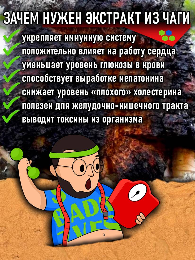 Гриб Чага полезные свойства, какой березовый гриб купить на сайте бадразвес с отзывами, расскажем о применении и противопоказаниях. Экстракт Гриба Чага обладает противовоспалительными и кровоостанавливающими свойствами, дубильные вещества, способные сворачивать белок, способствуют образованию защитной пленки на слизистых поверхностях органов. Плодовое тело чаги имеет в своем составе щавелевую, муравьиную, уксусную кислоты, полисахариды, клетчатку, смолы, которые улучшают аппетит, устраняют боли. Стерины снижают количество холестерина в крови. Если хотите больше узнать чем полезен экстракт Гриба Чаги, то подписывайтесь на наш научный YouTube
